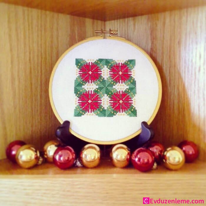 Bir önceki görselimizdeki ev deseninin farklı bir şekilde işlenmiş halini burada görebilirsiniz. Bu kez ev deseninin tek tarafı yaprak motifleriyle süslenmiş. Farklı ipler ve işleme tekniği ile değişik bir görüntü yakalayabilirsiniz.